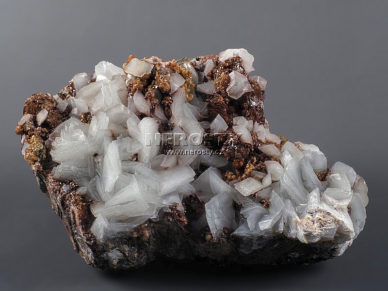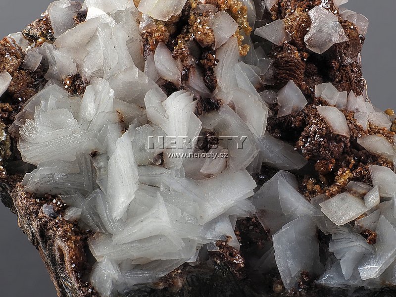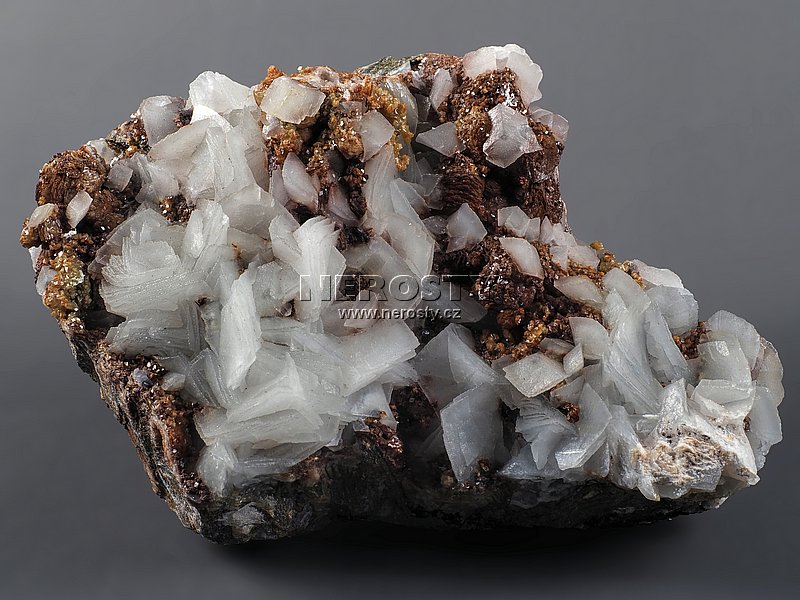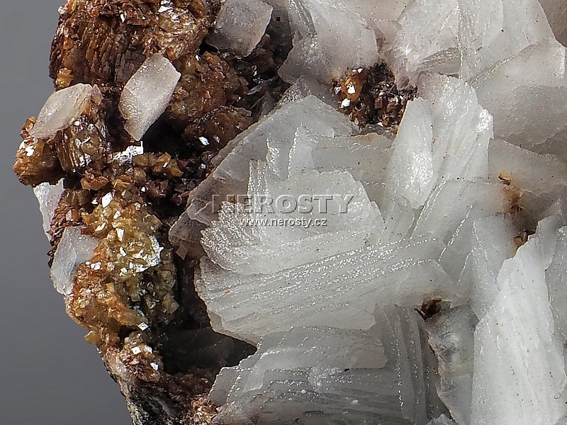 Na horninové podložce hustě porostlé drobným hnědým sideritem narůstají větší lupenité kalcitové krystaly vytvářející střechovitou strukturu.