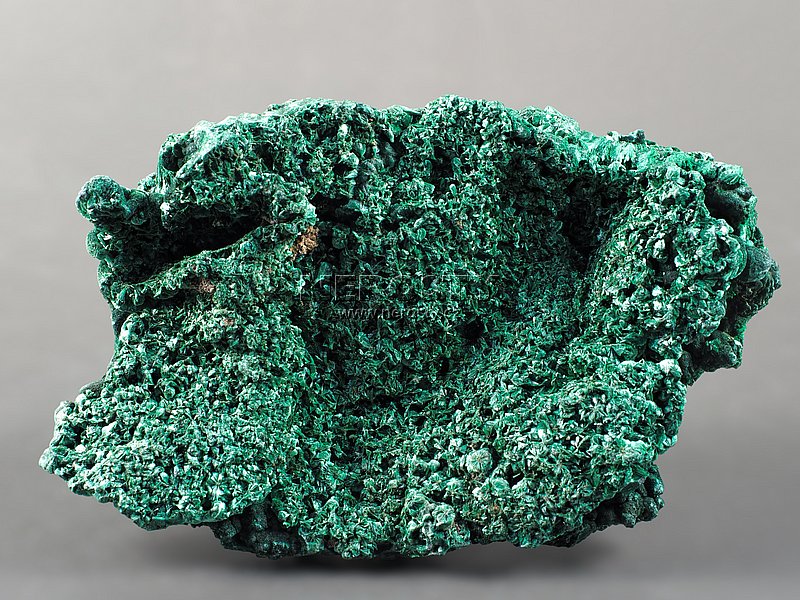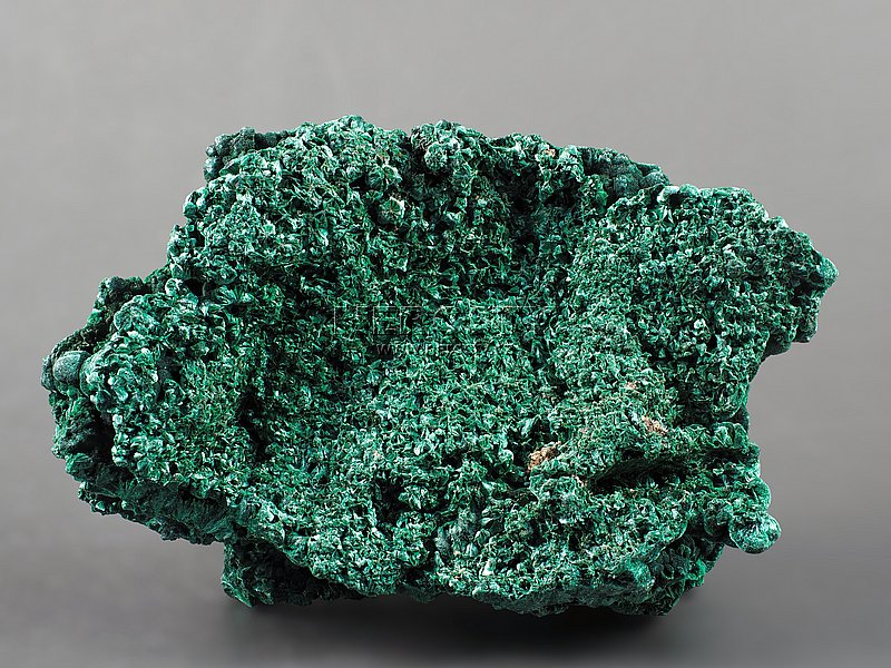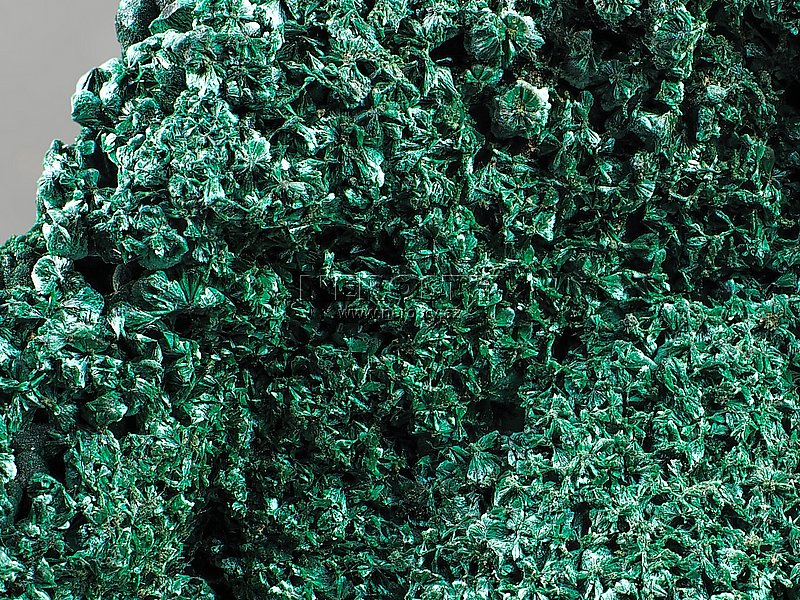 Oboustranný vzorek, tvořený hustě srostlými vějířky malachitových krystalů.