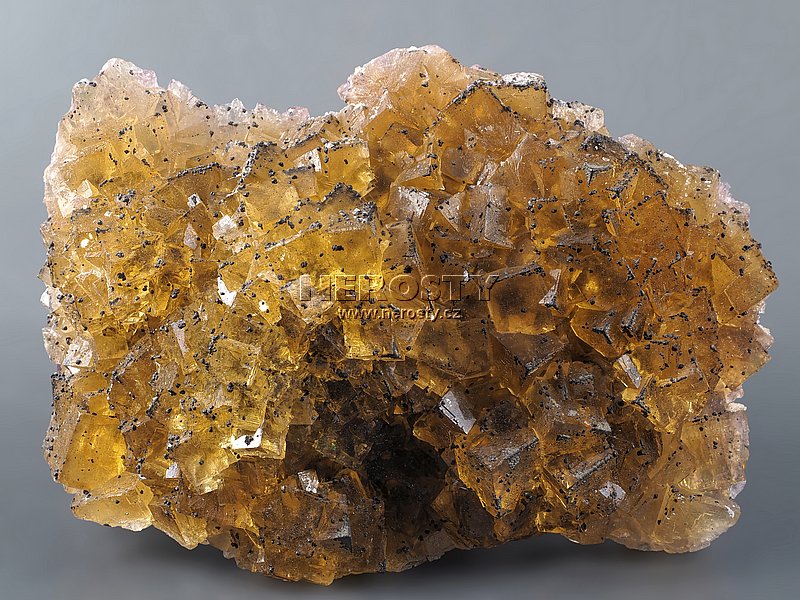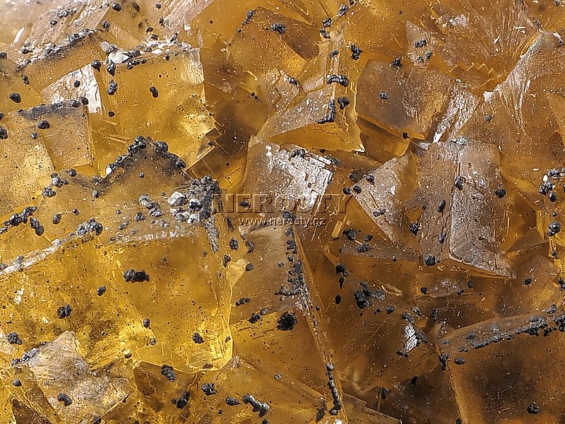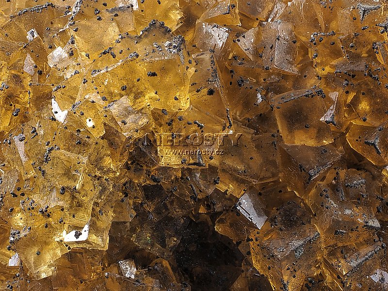 Drúza je tvořena čirými lesklými sytě žlutě až žlutooranžově zbarvenými krystaly fluoritu o velikosti do 15 mm. Na některých jsou narostlé drobounké tečky pyritu.