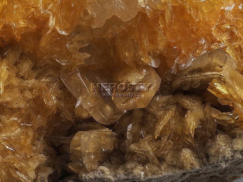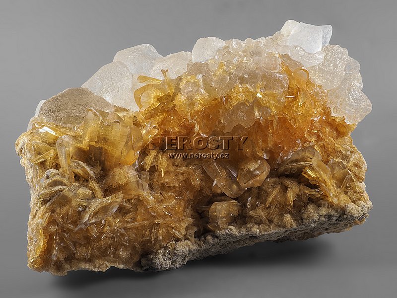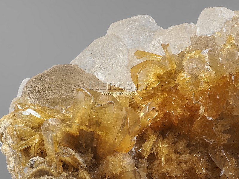 Medově oranžové krystaly sádrovce jsou lemovány velkými krystaly halitu - soli.