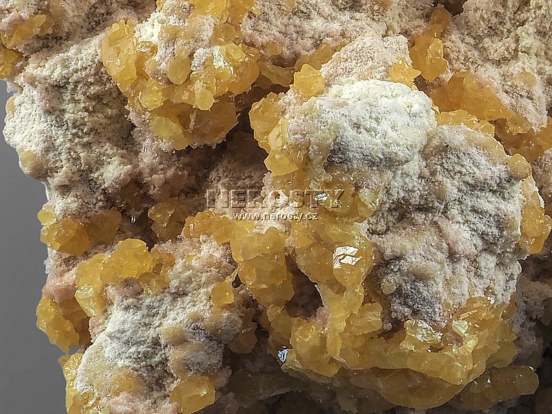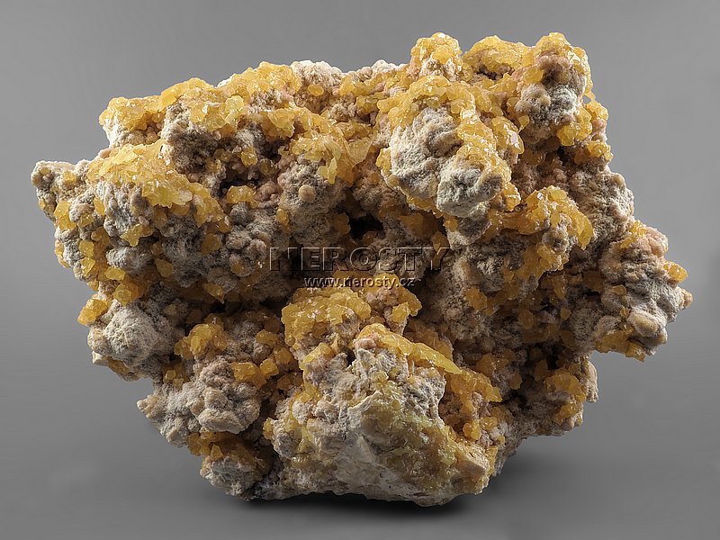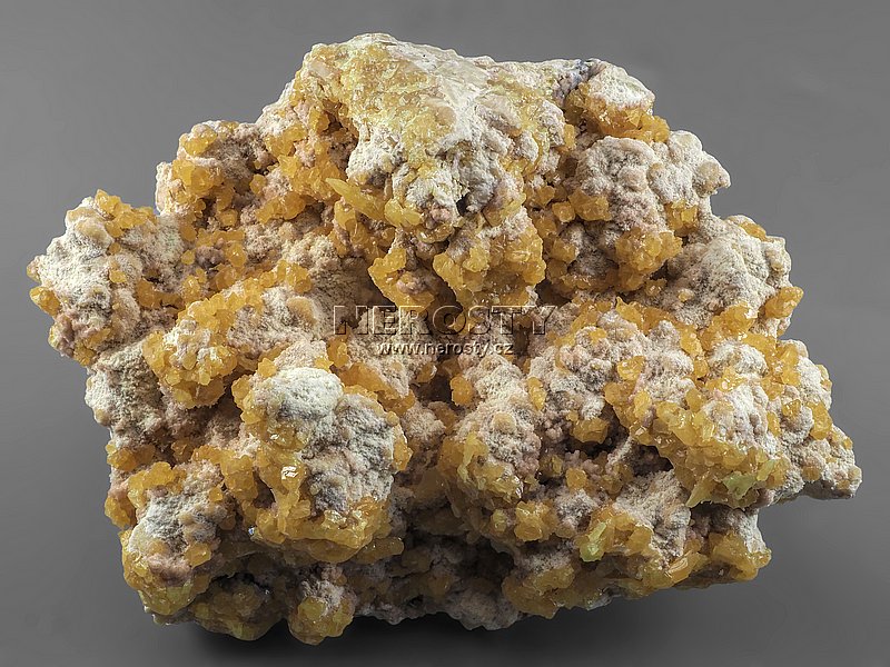 Členitý povrch vzorku tvořený světle žlutou sírou je hustě porostlý sytě žlutými lesklými krystaly druhé generace o velikosti do 1 cm.