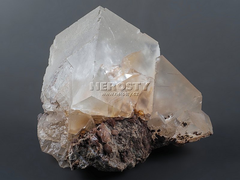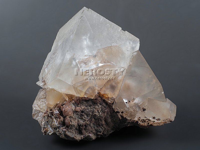 Dominantní 5,5 cm velký skelně lesklý a dobře průsvitný fluoritový krystal je obklopený několika menšími a spolu s nimi je narostlý na pyritem impregnované horninové podložce.