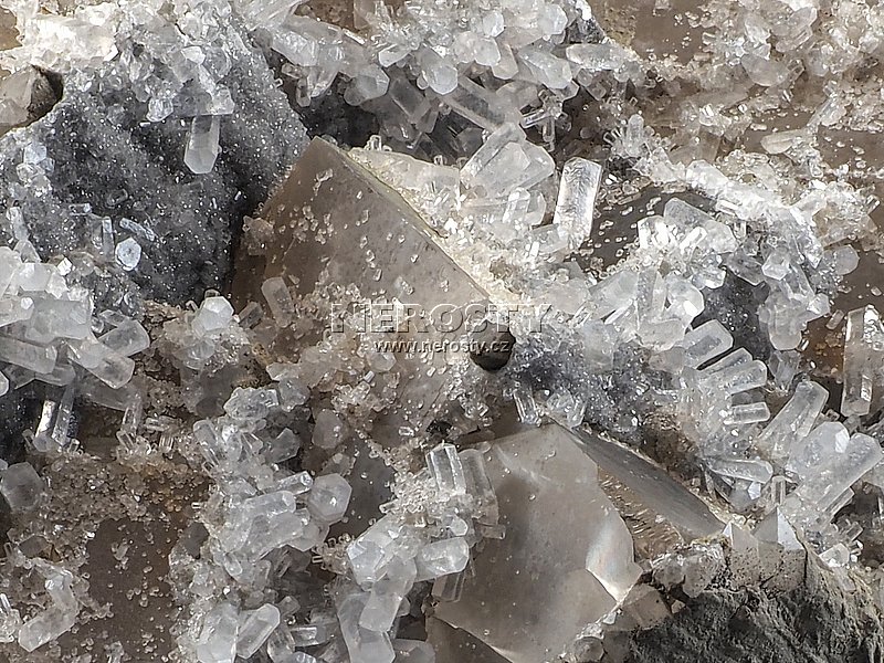 Na masivní podložce jsou narostlé velké fluoritové krystaly jejichž povrch je hustě pokrytý drobným kalcitem.