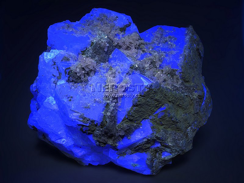 Tento vzorek fluoritu svítí při nasvícení UV světlem modře až modrofialově, kalcit pak karmínově.