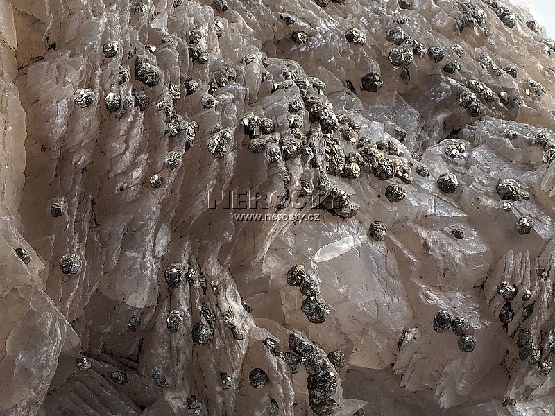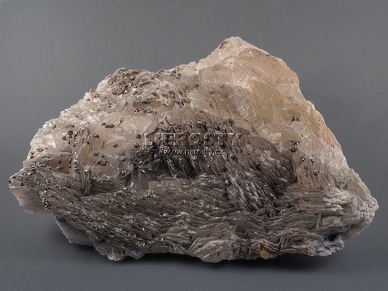 Velký dekorativní vzorek kalcitu v kombinaci s třpytivým pyritem.