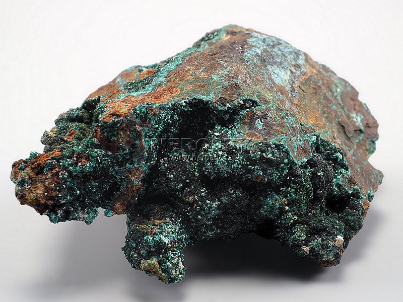 Výrazně členitý volně stojící vzorek tmavě zeleného brochantitu narostlého v dutinách limonitu. Brochantit je v nich místy prorostlý drobounkým malachitem, cerusitem a sádrovcem.