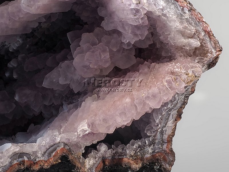 Část marocké geody vyplněné krystaly pastelově fialového ametystu.